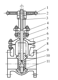 7- Corpo valvola 8 Piastra saracinesca 9 - Anello di tenuta 10 - Stelo valvola 11 - Bullone di connessione