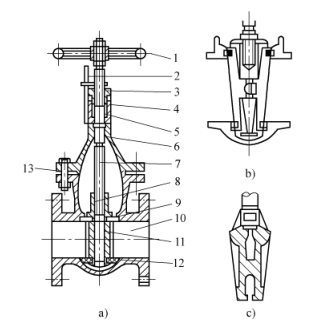 2) Valvola a saracinesca a cuneo con stelo nascosto: come mostrato nella Figura 2, la superficie di tenuta di questa valvola è inclinata e forma un angolo. Maggiore è la temperatura media, maggiore è l'angolo. Le piastre con cancello a cuneo sono classificate in piastre con cancello singolo, piastre con cancello doppio e piastre con cancello elastico, come mostrato rispettivamente nelle Figure 2a, b e c. La lavorazione, la rettifica e la manutenzione delle piastre a saracinesca a cuneo sono più complicate di quelle delle piastre a saracinesca parallela, ma hanno prestazioni di tenuta migliori.